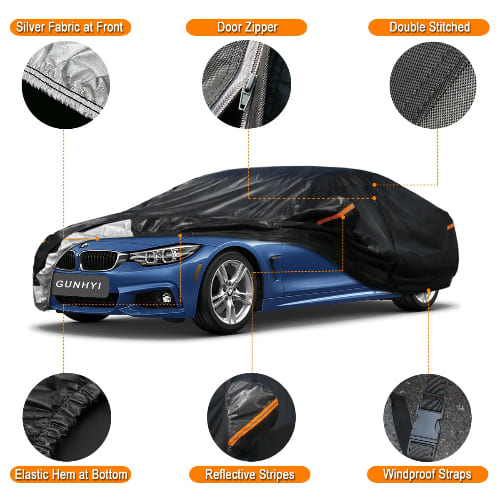 GUNHYI car covers use multi-layer construction, typically combining aluminum layers for sun protection, PE/PEVA layers for waterproofing, and a soft cotton inner lining to prevent scratches.